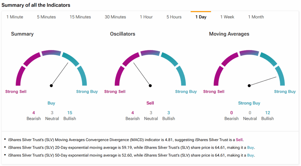 팁랭크스의 기술적 분석 도구를 사용하면, 지표들은 은에 대한 긍정적인 전망을 가리키는 것으로 보인다. 실제로 아래 요약 섹션은 15개의 지표가 강세를 나타내고 있으며, 3개는 중립, 4개는 약세 지표임을 보여준다.