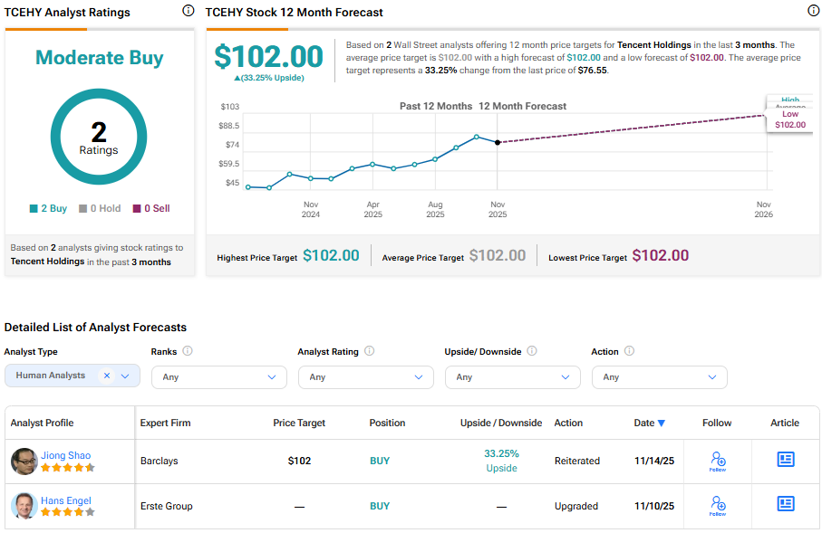 텐센트 홀딩스는 월가 애널리스트들의 광범위한 커버리지를 받지 못하고 있으며, 단 두 개의 평가만 제출되었다. 이 주식은 보통 매수 컨센서스를 보유하고 있으며, 평균 TCEHY 주가 목표는 102달러다. 이는 현재 가격 대비 33.25%의 상승 여력을 의미한다.