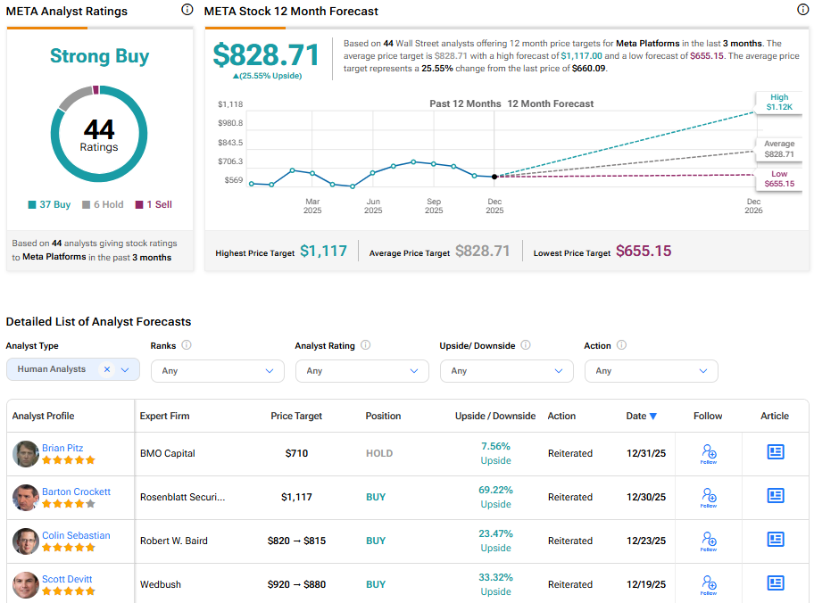 증권가에서 메타 플랫폼스는 여전히 강력 매수 의견을 유지하고 있다. 44개 의견 중 37명의 애널리스트가 매수, 6명이 보유, 1명이 매도 의견을 제시했다. 메타 주식의 평균 목표주가는 828.71달러로, 현재 주가 대비 25.55% 상승 여력을 시사한다.