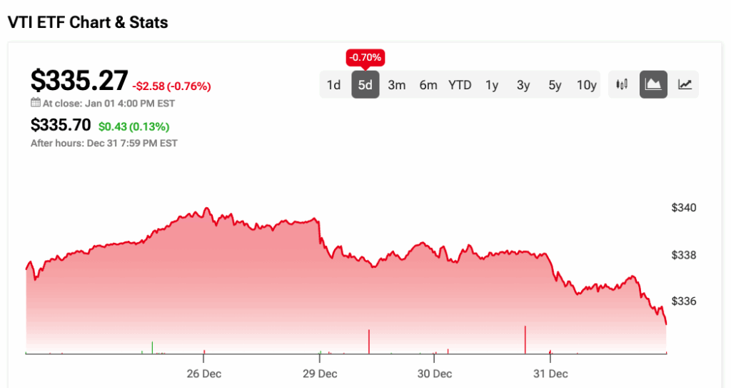 미국 주식시장 전체에 대한 광범위한 노출을 제공하는 뱅가드 토탈 스톡 마켓 ETF (VTI)는 2025년 마지막 거래일에 0.76% 하락했다. 미국 주식시장은 급격한 변동성과 높은 불확실성으로 점철된 한 해를 마감하며 주요 지수들이 부진한 모습을 보이면서 2025년을 침체된 분위기로 마무리했다. 전반적으로 VTI ETF는 지난 5일간 0.70% 하락했지만, 2025년 한 해 동안 약 17% 상승했다.