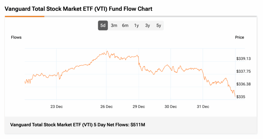 VTI의 3개월 평균 거래량은 413만 주다. 한편, 5일간 순유입액은 5억 1,100만 달러를 기록하며 지난 5거래일 동안 투자자들이 VTI에 자금을 유입한 것으로 나타났다.