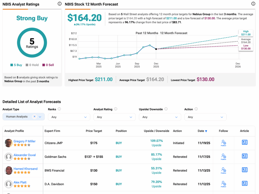 증권가 애널리스트들에 따르면 네비우스 주식은 지난 3개월간 부여된 5개의 매수 등급 모두에 힘입어 강력 매수 컨센서스를 받고 있다. 한편 NBIS 주식의 평균 목표주가 164.20달러는 현재 가격에서 96.17%의 상승 여력을 의미한다.