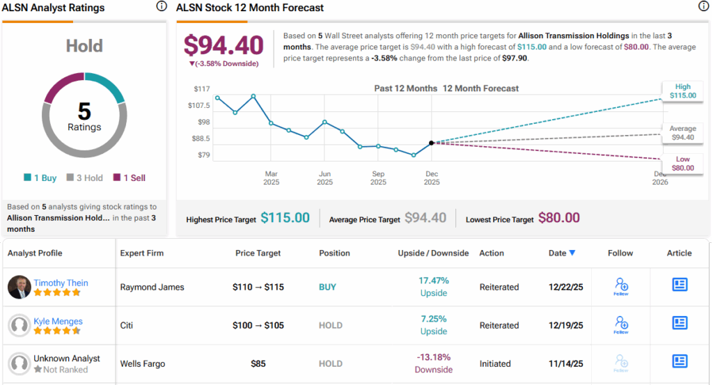 그러나 타인은 현재 월가에서 유일한 ALSN 강세론자다. 이 주식의 보유 컨센서스 의견은 최근 5건의 리뷰에서 도출되었다. 매수 1건, 보유 3건, 매도 1건이다. ALSN 주식은 97.90달러에 거래되고 있으며, 평균 목표주가 94.40달러는 2026년에 3.5%의 잠재적 하락을 나타낸다. (ALSN 주가 전망 참조)