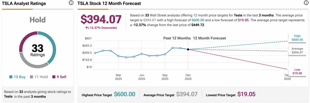 증권가는 테슬라 주식에 대해 관망세를 유지하고 있다. 팁랭크스에서 TSLA 주식은 매수 13건, 보유 11건, 매도 9건을 기반으로 보유 컨센서스 등급을 받고 있다. 테슬라의 평균 목표주가 394.07달러는 현재 수준에서 12.4%의 하락 여력을 시사한다.