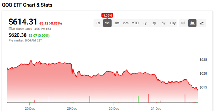 인베스코 QQQ ETF(QQQ)는 나스닥 100 지수(NDX)의 성과를 추종하는 상장지수펀드로, 2026년 첫 거래일인 금요일 장전 거래에서 기술주 강세에 힘입어 약 1% 상승했다.