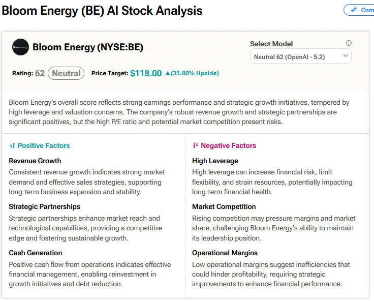 블룸 에너지 (BE) 주식은 팁랭크스의 AI 주식 분석 도구로부터 중립 등급을 받았다.