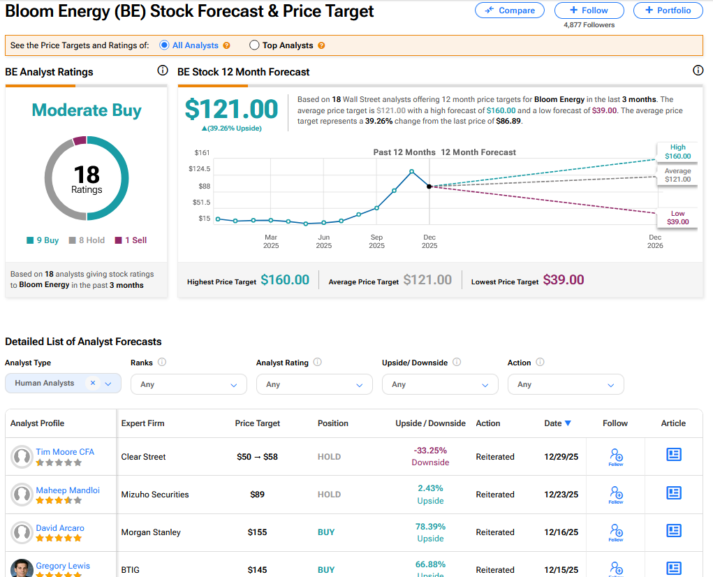 팁랭크스에서 BE는 매수 9건, 보유 8건, 매도 1건을 기반으로 적극 매수 컨센서스를 받고 있다. 최고 목표주가는 160달러다. BE 주식의 컨센서스 목표주가는 121달러로, 39.26%의 상승 여력을 시사한다.