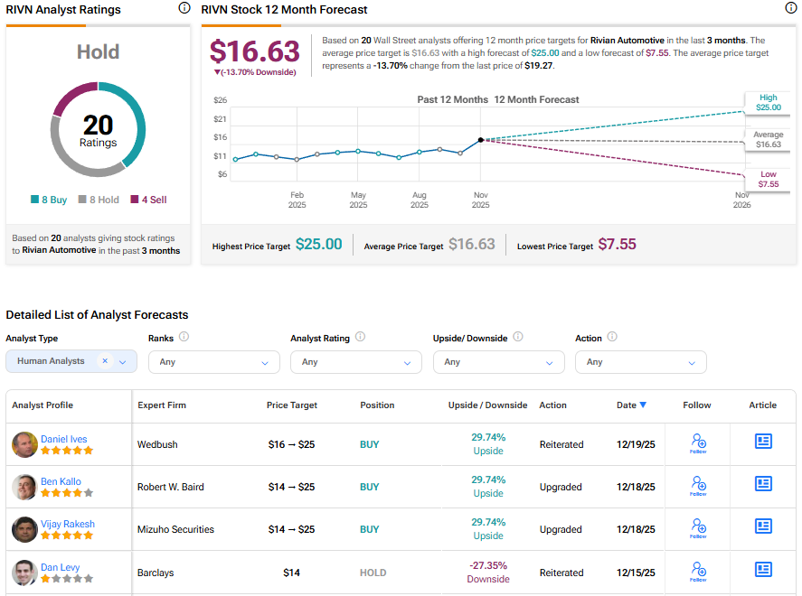 월가를 보면, 애널리스트들은 지난 3개월간 8건의 매수, 8건의 보유, 4건의 매도 의견을 제시하며 RIVN 주식에 대해 보유 컨센서스 등급을 부여했다. 또한 평균 RIVN 목표주가는 주당 16.63달러로 13.9%의 하락 여력을 시사한다.