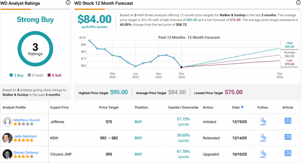 제프리스 애널리스트 허윗은 이 주식을 다루면서 회사의 견고한 기반을 기본부터 검토한다. "워커 앤 던롭은 수수료 기반의 서비싱, 자문, 자본시장 사업을 통해 어려운 금리 환경에서도 역사적으로 긍정적인 수익을 유지해왔다. 이러한 수익 구성은 단기 금리 변동성을 넘어서고 최고 발행 규모보다는 정상화된 수수료 창출에 기반한 밸류에이션 프레임워크를 지원한다. 서비싱과 자산 관리는 약 5억 달러의 안정적이고 계약적인 수익을 창출하며, 에스크로 잔액은 단기 금리가 하락하더라도 매력적인 수익 레버리지를 제공한다."
