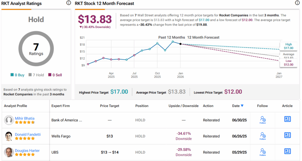 다시 매튜 허윗으로 돌아가면, 제프리스 애널리스트는 여러 요인을 근거로 낙관적인 견해를 취하고 있다. 허윗은 이 회사에 대해 "로켓은 더 이상 단순한 모기지 제조업체가 아니다. 고객을 한 번 확보하여 검색부터 결제까지, 그리고 대출 기간 전체에 걸쳐 지원하도록 설계된 수직 통합 시스템이다. RKT 주가는 아직 2025년 미스터 쿠퍼와 레드핀 인수로 인한 수익력, 회복력, 전략적 포지셔닝의 단계적 변화를 반영하지 못하고 있다. 우리는 정상화된 연간 2조 5천억 달러 모기지 시장에서의 주당순이익이 컨센서스 모델보다 높을 것으로 예상하며, 현재의 통합 노이즈가 중기를 언더라이트할 의향이 있는 투자자들에게 매력적인 진입점을 제공한다고 본다"고 말한다.
