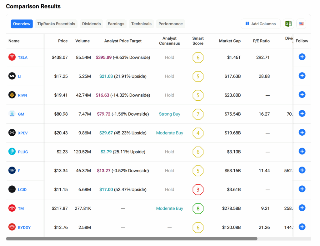 팁랭크스 주식 비교 도구를 사용하면 투자자들은 여러 전기차 제조업체와 기타 자동차 제조업체의 주식을 비교할 수 있다. 아래 이미지를 참조하라.