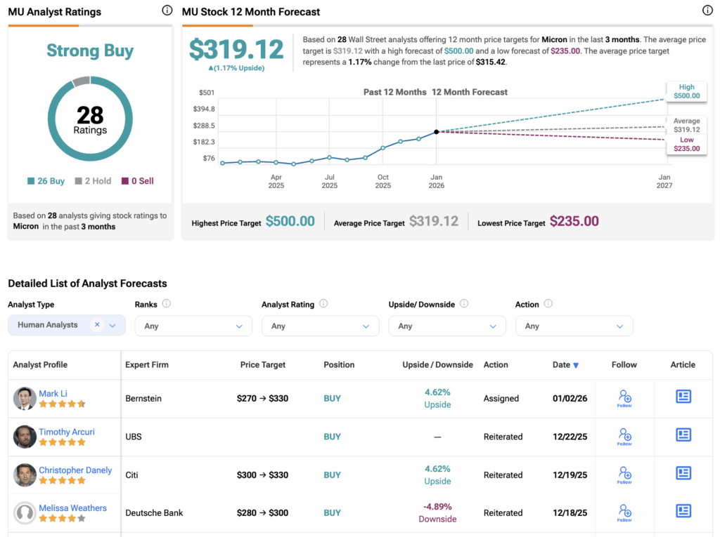 마이크론 테크놀로지(MU) 주식이 금요일 315.42달러로 사상 최고치를 기록했으며, 오늘 프리마켓 거래에서 3.6% 추가 상승했다. 이번 랠리는 최고 등급 애널리스트인 번스타인의 마크 리가 MU에 대한 목표주가를 270달러에서 330달러로 상향 조정하면서 매수 의견을 유지한 데 따른 것이다. 이번 상향 조정은 마이크론이 2025년 200% 이상의 수익률을 기록하며 강력한 상승세를 이어가고 있는 가운데 나왔다.