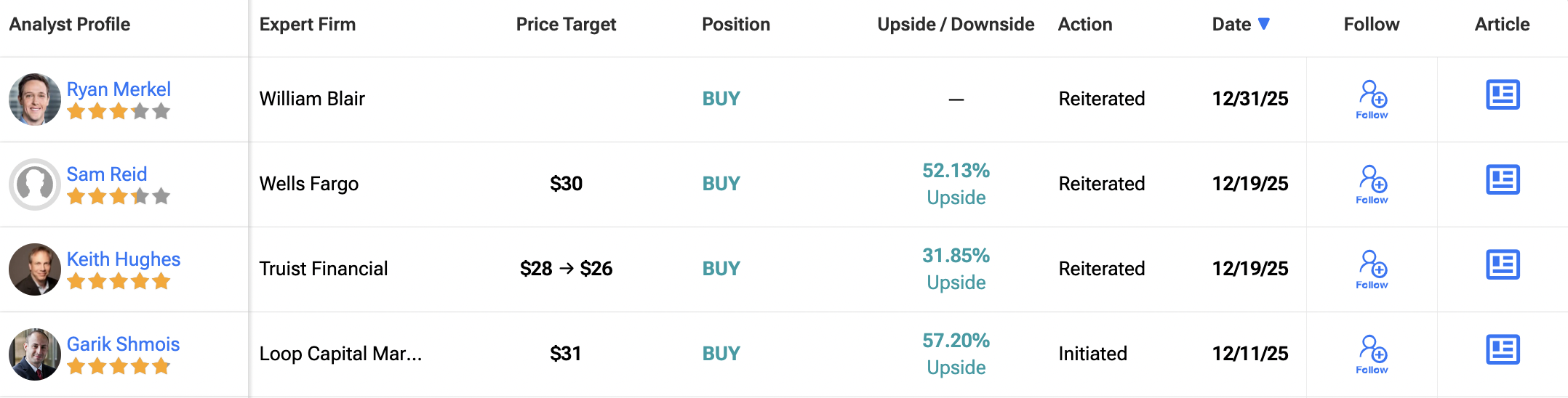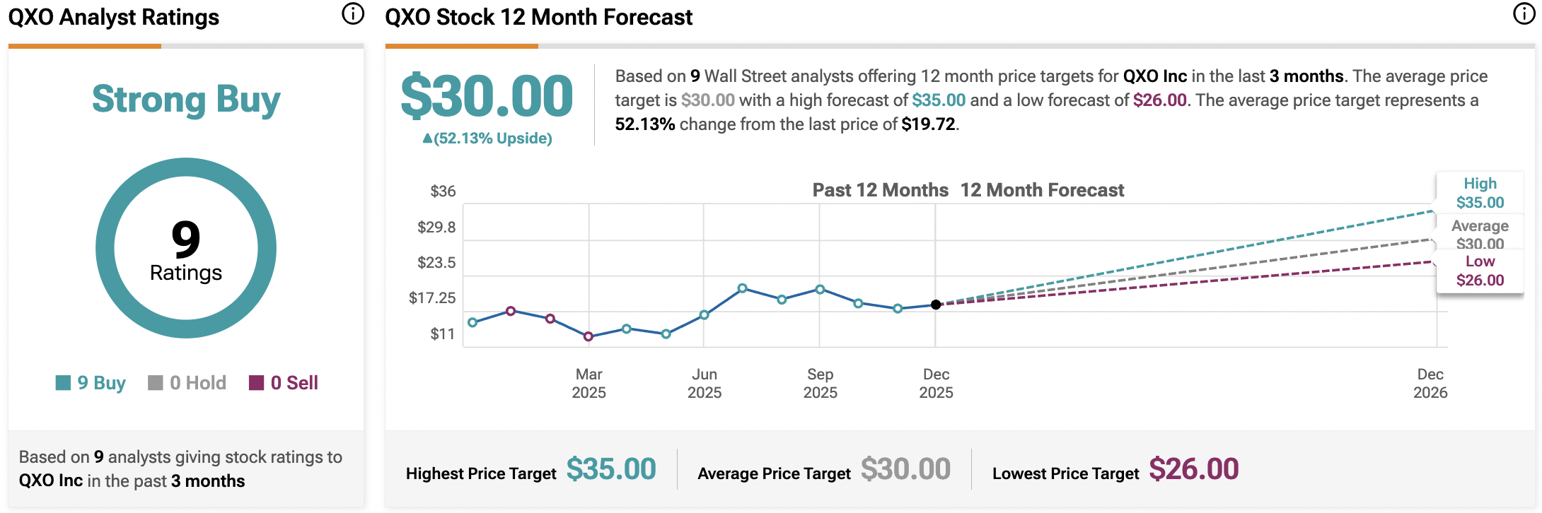 QXO Inc.는 현재 월가 애널리스트들 사이에서 강력 매수 컨센서스 등급을 받고 있다. 이 등급은 최근 3개월 동안 발표된 9건의 매수 의견에 기반한 만장일치 평가다. 평균 12개월 QXO 주가 목표는 30.00달러로, 마지막 기록된 가격 대비 52%의 상당한 상승 여력을 시사한다.