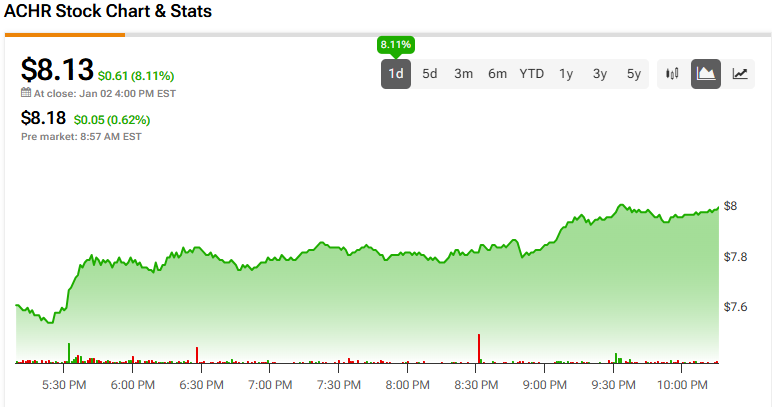 한편 ACHR 주가는 금요일 8.11% 크게 상승하여 8.13달러에 마감했다. 주가는 장전 거래에서도 상승세를 유지하고 있다.