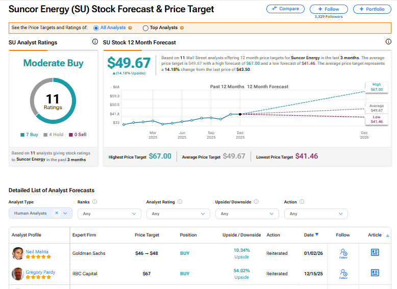 선코어 에너지 주식은 월가 애널리스트 11명 사이에서 보통 매수 의견을 받고 있다. 이 의견은 최근 3개월간 발표된 매수 7건과 보유 4건을 기반으로 한다. 평균 SU 목표주가 49.67달러는 현재 수준 대비 14.18% 상승 여력을 시사한다.