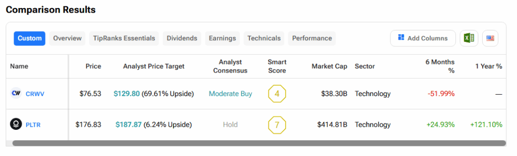 팁랭크스의 주식 비교 도구를 사용한 결과, 코어위브는 중립 매수 컨센서스 등급을 받았으며, 팔란티어는 월가 애널리스트들로부터 보유 등급을 받았다.