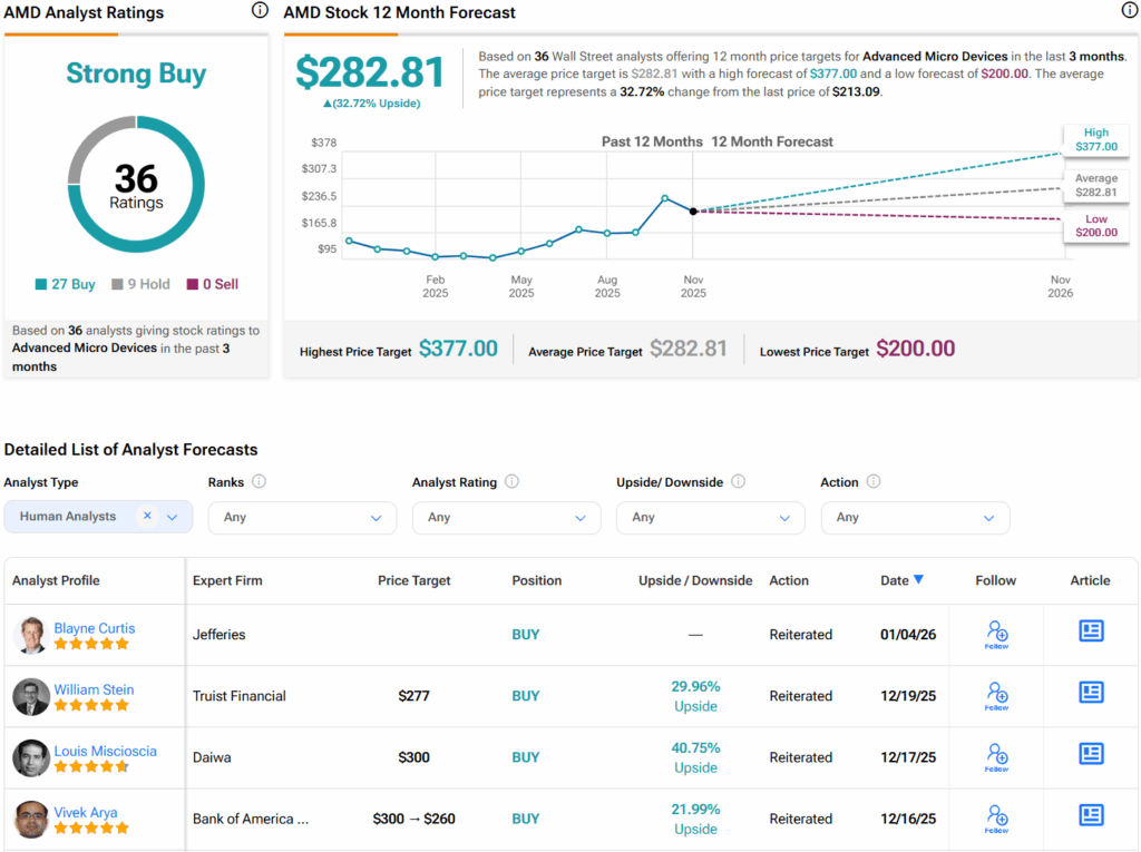월가로 눈을 돌리면, 애널리스트들은 AMD 주식에 대해 강력 매수 컨센서스 등급을 부여하고 있다. 아래 그래픽에서 볼 수 있듯이, 지난 3개월 동안 27건의 매수, 9건의 보유, 0건의 매도 의견이 제시됐다. 또한 주당 282.81달러의 AMD 평균 목표주가는 32.7%의 상승 여력을 시사한다.