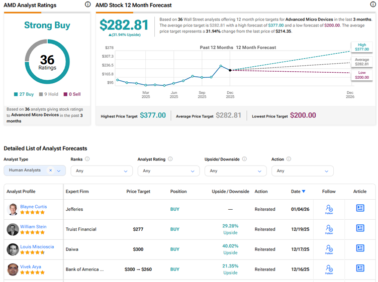 전반적으로 월가는 어드밴스드 마이크로 디바이시스 주식에 대해 매수 27건, 보유 9건을 기반으로 적극 매수 컨센서스 의견을 제시하고 있다. 평균 AMD 주가 목표치인 282.81달러는 약 32%의 상승 여력을 시사한다.