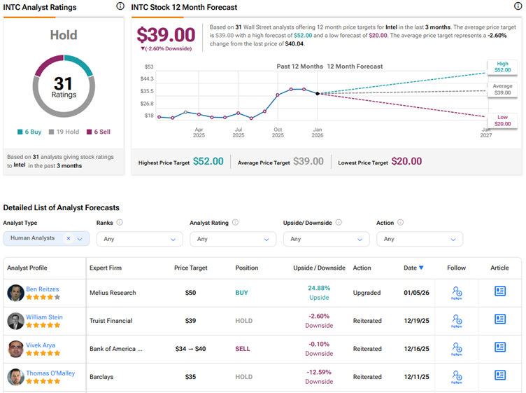 전반적으로 월가는 인텔 주식에 대해 보유 19건, 매수 6건, 매도 6건을 기반으로 보유 컨센서스 의견을 제시하고 있다. 평균 INTC 주가 목표치인 39달러는 현재 수준에서 2.6%의 하락 위험을 시사한다.