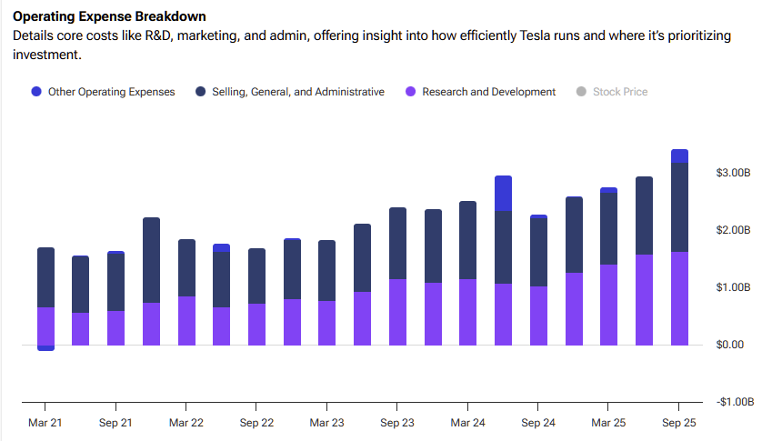 하지만 모든 것이 장밋빛인 것은 아니다. 영업이익은 지난 1년간 40%나 감소했고, 영업이익률은 거의 6% 하락했다. 모든 기업이 AI 지출에 올인하는 것처럼 보이는 환경에서, 그리고 테슬라가 복잡한 관세 체제, 불확실한 규제 환경, 진행 중인 구조조정을 다루고 있는 시점에서, 단기 미래는 시장이 원하는 것보다 다소 험난해 보인다.