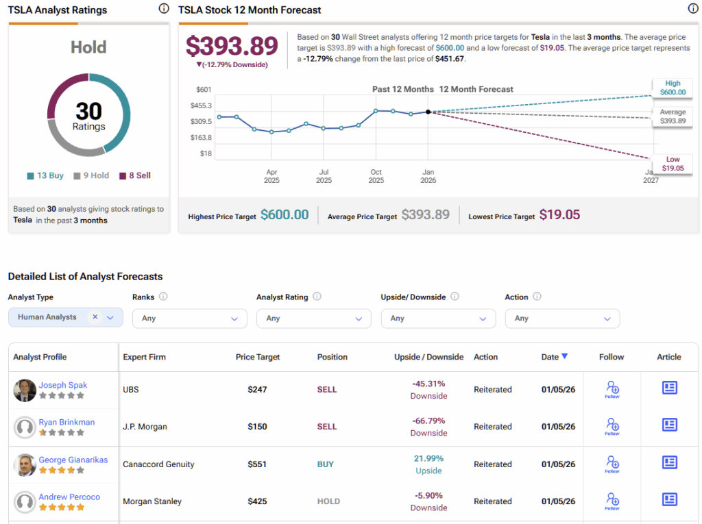 월가에서 TSLA 주식은 지난 3개월간 매수 13건, 보유 9건, 매도 8건을 기반으로 보유 컨센서스 등급을 받고 있다. TSLA의 평균 목표주가 393.89달러는 향후 12개월간 약 13%의 하락 가능성을 시사한다.