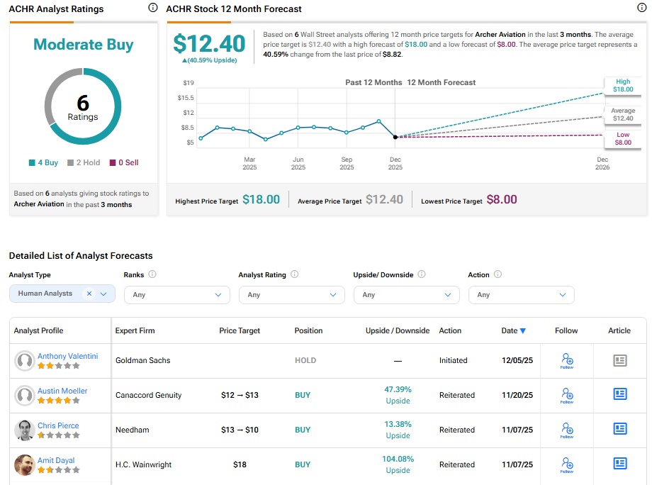 월가 증권가는 회사의 전망에 대해 조심스럽게 낙관적인 입장을 유지하고 있다. 최근 6개의 평가를 기반으로 아처 에비에이션은 "보통 매수" 의견을 받았으며 평균 ACHR 주가 목표치는 12.40달러다. 이는 현재 가격 대비 40.59%의 상승 여력을 의미한다.