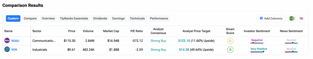 투자자들은 팁랭크스 주식 비교 도구를 사용해 이들 종목을 살펴볼 수 있다. ROKU와 KDK 모두 증권가로부터 강력 매수 등급을 받았지만, 코디악 AI는 거의 50%의 상승 여력을 제공하는 반면 로쿠는 11.6%의 보다 완만한 상승 전망을 보인다.