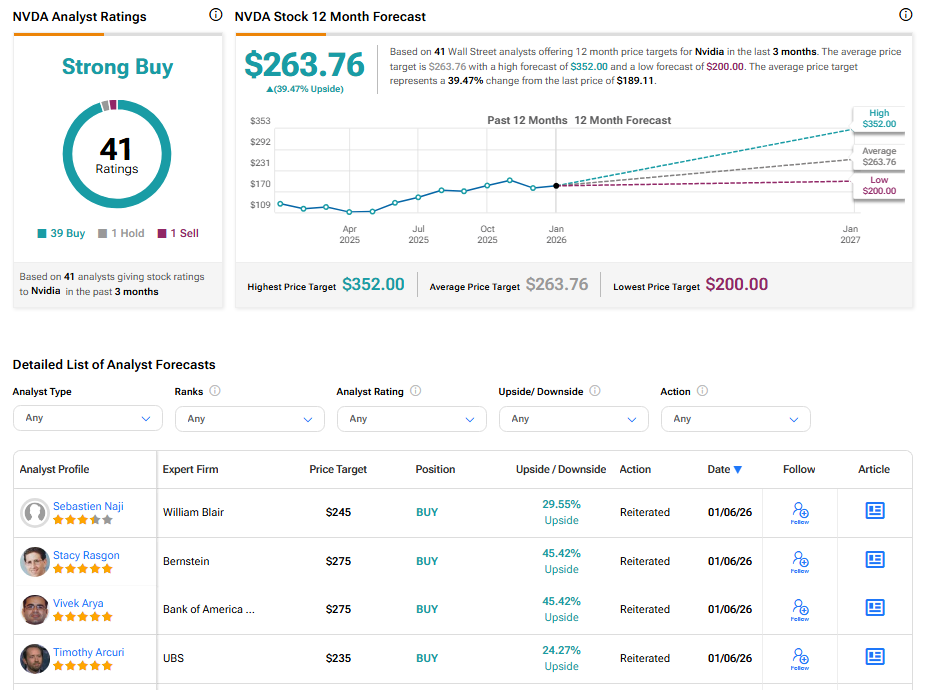 팁랭크스에서 엔비디아 주식은 39개의 매수, 1개의 보유, 1개의 매도 의견을 바탕으로 강력 매수 컨센서스 등급을 받고 있습니다. 엔비디아의 평균 목표주가 263.76달러는 현재 수준에서 39.5%의 상승 여력을 시사합니다. 지난 1년간 NVDA 주식은 약 35% 상승했습니다.