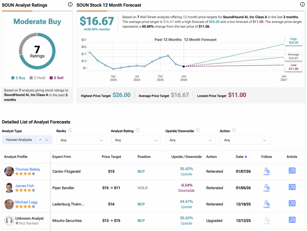 팁랭크스에 따르면, SOUN 주식은 지난 3개월간 5건의 매수와 2건의 보유 의견을 받아 보통 매수 컨센서스 등급을 받았다. 평균 사운드하운드 주식 목표주가는 16.67달러로, 현재 수준에서 51%의 상승 여력을 시사한다.