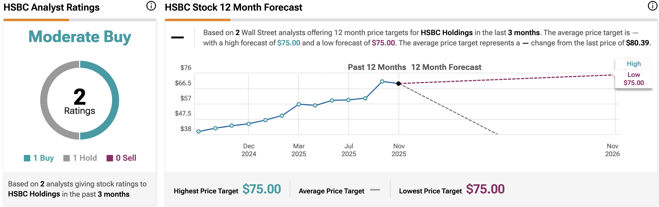HSBC는 월가 애널리스트들 사이에서 보통 매수 컨센서스 등급을 받고 있다. 이 등급은 지난 3개월 동안 발표된 매수 1건과 보유 1건을 기반으로 한다.
