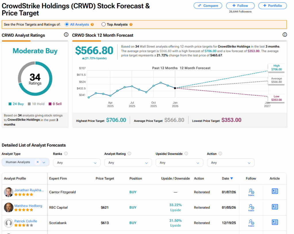 팁랭크스에서 크라우드스트라이크는 24개 매수와 10개 보유 의견을 바탕으로 보통 매수 컨센서스를 받고 있다. 최고 목표주가는 706달러다. 크라우드스트라이크 주식의 컨센서스 목표주가는 566.80달러로, 21.72% 상승 여력을 시사한다.