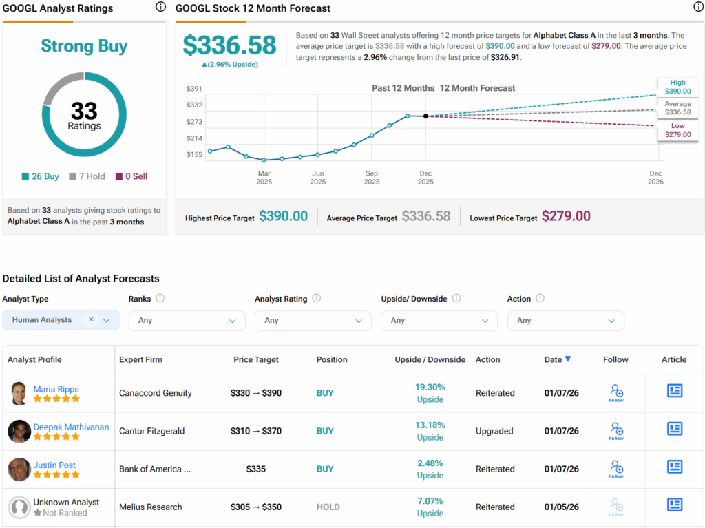 월가 증권가는 지난 3개월간 26건의 매수와 7건의 보유 의견을 바탕으로 GOOGL 주식에 대해 강력 매수 컨센서스 등급을 부여했다. 또한 GOOGL의 평균 목표주가는 주당 336.58달러로 3%의 상승 여력을 시사한다.