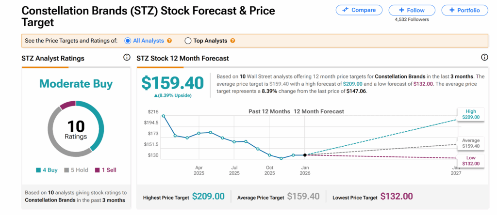 또한 STZ 평균 목표주가는 159.40달러로 현재 거래 수준 대비 약 8%의 상승 여력을 시사한다.