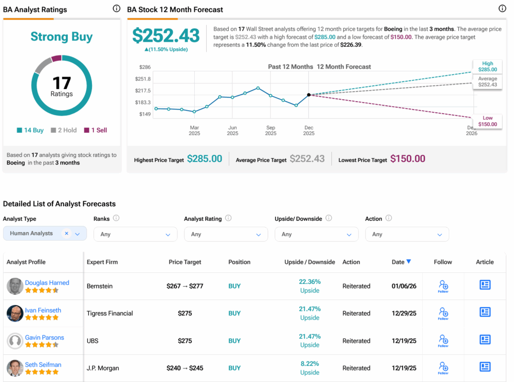 월가로 눈을 돌리면, 애널리스트들은 아래 그래픽에 표시된 것처럼 지난 3개월 동안 매수 14건, 보유 2건, 매도 1건을 기반으로 BA 주식에 대해 강력 매수 컨센서스 등급을 부여했다. 지난 1년 동안 주가가 32.81% 상승한 후, 주당 252.43달러의 평균 BA 목표주가는 11.5%의 상승 여력을 시사한다.