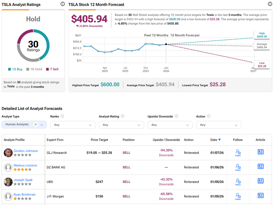 머스크의 대부분 기업은 비상장이지만, 개인 투자자들은 그의 대표 기업인 테슬라에 투자할 수 있다. 애널리스트들은 현재 지속되는 역풍으로 인해 테슬라의 장기 전망에 대해 중립적인 입장을 유지하고 있다. 팁랭크스에서 TSLA는 매수 13건, 보유 10건, 매도 7건을 기반으로 보유 컨센서스 등급을 받고 있다. 테슬라의 평균 목표주가 405.94달러는 현재 수준에서 6.9% 하락 여력을 시사한다. 연초 대비 TSLA 주가는 10.4% 상승했다.