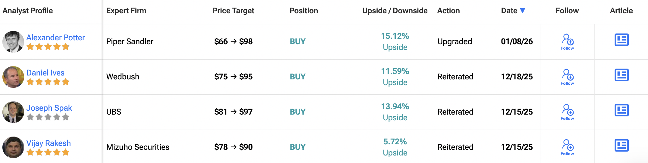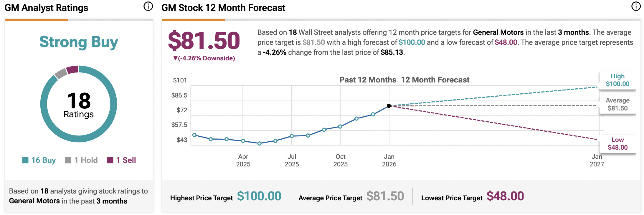 월가로 눈을 돌리면, GM 주식은 지난 3개월 동안 매수 16건, 보유 1건, 매도 1건을 기록하며 강력 매수 컨센서스 등급을 받고 있다. 평균 12개월 GM 목표주가는 81.50달러로, 4.3%의 하락 위험을 시사한다.