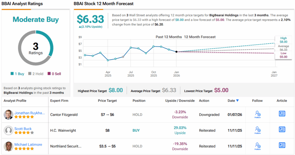 월가는 현재 BBAI에 큰 관심을 기울이지 않는 것으로 보인다. 그럼에도 불구하고 매수 1건과 보유 2건으로 BBAI는 컨센서스 중립 매수 등급을 받고 있다. 12개월 평균 목표주가 6.33달러는 2026년 최소한의 상승을 의미한다. (BBAI 주가 전망 참조)