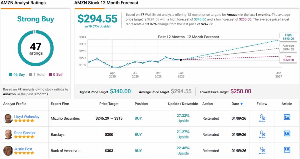 거의 모든 증권가 애널리스트들이 같은 방향으로 생각하고 있다. 이 주식은 매수 46건 대 보유 1건의 조합을 바탕으로 강력 매수 컨센서스 등급을 받고 있다. 평균 목표주가 294.55달러는 12개월 수익률 19%를 가리킨다. (AMZN 주가 전망 참조)