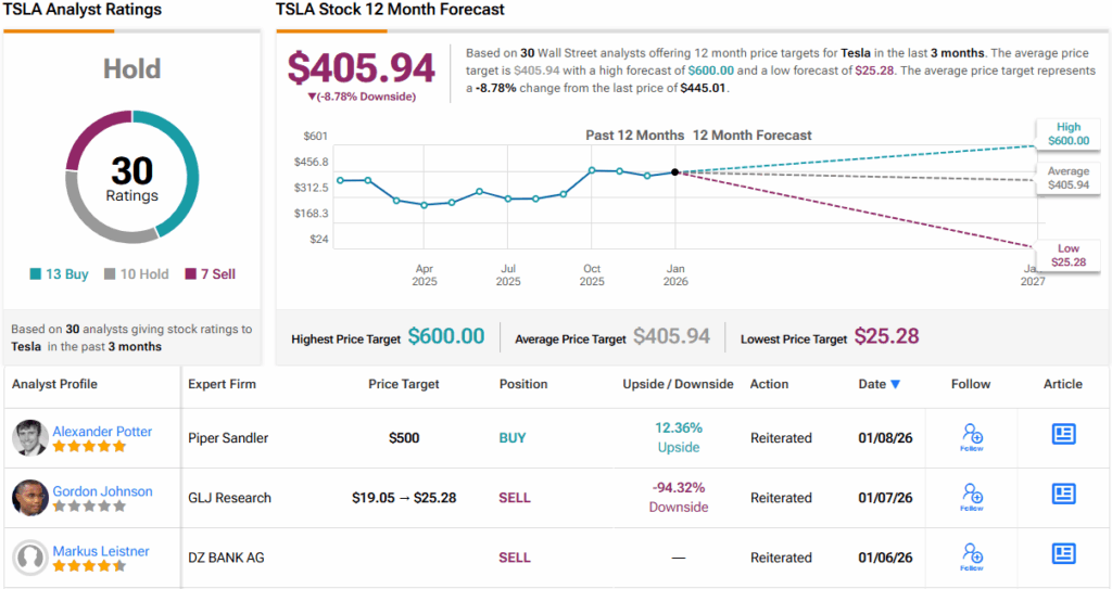 월가의 입장은 그러한 긴장을 반영한다. 13명의 애널리스트가 일론 머스크에게 의심의 여지를 기꺼이 주는 반면, 10명은 관망하고 7명은 매도를 권고하여 컨센서스 보유(즉, 중립) 등급을 받았다. 한편, 월가의 12개월 평균 목표주가 405.94달러는 현재 수준에서 한 자릿수 높은 하락 여지를 시사한다. (TSLA 주가 전망 참조)