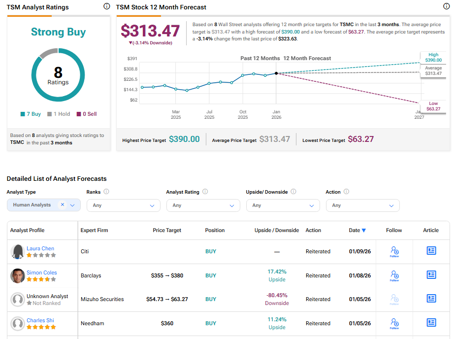 월가에서 TSM은 현재 7건의 매수, 1건의 보유, 0건의 매도를 기반으로 강력 매수 컨센서스 등급을 받고 있다. 주당 TSM 평균 목표주가 313.47달러는 컨센서스 기준 3.14% 하락 여력을 나타낸다.