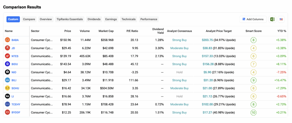 팁랭크스 주식 비교 도구를 사용하여 주요 중국 기업들을 정리했다. 투자자들이 핵심 성과 지표를 기준으로 비교할 수 있도록 돕기 위해서다. 아래는 참고용 스크린샷이다.
