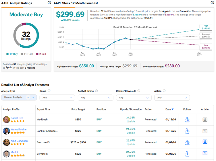현재 월가는 애플 주식에 대해 매수 19건, 보유 11건, 매도 2건을 기반으로 보통 매수 컨센서스 의견을 제시하고 있다. AAPL 주식의 평균 목표주가는 299.69달러로 15%의 상승 여력을 시사한다.