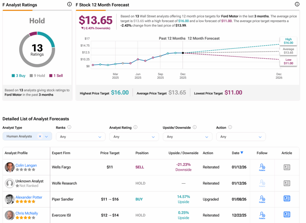 월가에서 애널리스트들은 지난 3개월간 매수 3건, 보유 9건, 매도 1건을 제시하며 F 주식에 대해 보유 의견을 보이고 있다. 지난 1년간 주가가 46.24% 상승한 후, F의 평균 목표주가는 주당 13.65달러로 2.43%의 하락 여력을 시사한다.