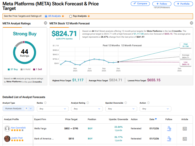 메타 플랫폼스 주식은 월가 애널리스트 44명으로부터 적극 매수 의견을 받고 있다. 이 등급은 최근 3개월간 발표된 매수 37건, 보유 6건, 매도 1건을 기반으로 한다. META 평균 목표주가 824.71달러는 현재 수준 대비 28.47% 상승 여력을 시사한다.