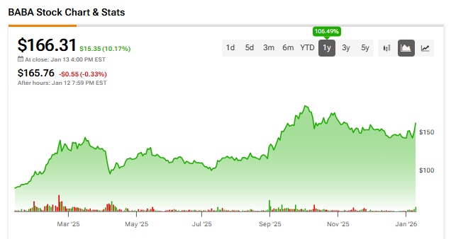 알리바바 주식은 월요일 장중 급등했으나 시간외 거래에서 0.33% 하락했다. 그럼에도 불구하고 주가는 전반적으로 강력한 상승세를 보이고 있다. 주가는 지난 1년간 약 106% 상승했으며 지난 6개월간 약 53% 올라 알리바바의 클라우드 사업, AI 추진, 광범위한 기술 이니셔티브에 대한 신뢰가 높아지고 있음을 반영하고 있다.