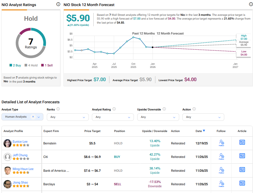 전반적으로 월가는 니오 주식에 대해 보유 의견을 제시하고 있으며, 최근 3개월간 매수 2건, 보유 4건, 매도 1건의 의견이 나왔다. 평균 니오 주가 목표가는 5.90달러로 현재 수준 대비 21.65%의 상승 여력을 시사한다.