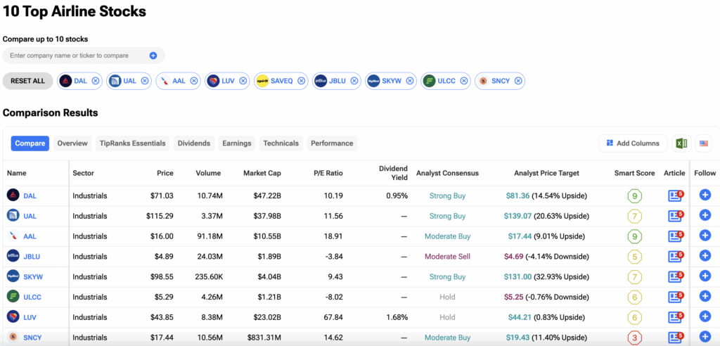 여파를 지켜보는 투자자들은 팁랭크스 주식 비교 도구에서 항공사 주식들을 비교할 수 있다. 아래 이미지를 클릭하면 자세한 정보를 확인할 수 있다.
