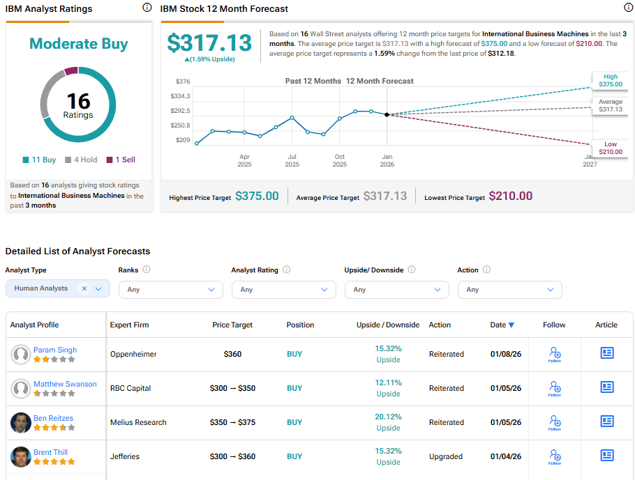 증권가에서 인터내셔널 비즈니스 머신즈는 보통 매수 의견을 받고 있다. IBM 주식의 평균 목표주가는 317.13달러로, 현재 가격 대비 1.59% 상승 여력을 시사한다.