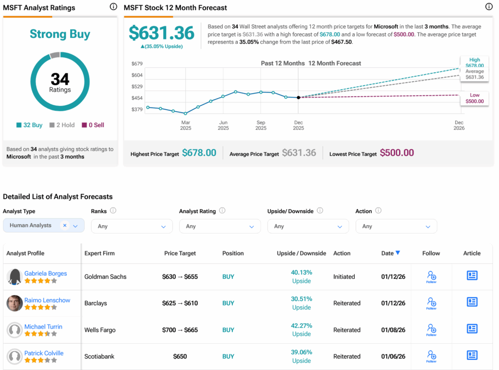 월가를 보면, 애널리스트들은 지난 3개월 동안 매수 32건과 보유 2건을 기록하며 MSFT 주식에 대해 강력 매수 컨센서스 등급을 부여했다. 지난 1년간 주가가 14.8% 상승한 후, 평균 MSFT 목표주가는 주당 631.36달러로 35.05%의 상승 여력을 시사한다.