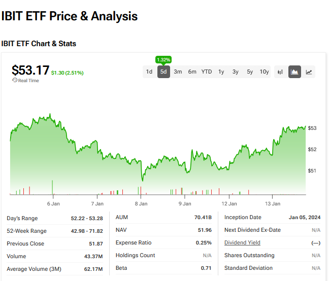 아이셰어즈 비트코인 트러스트 ETF(IBIT)가 화요일 훌륭한 성과를 기록했다. 최근 5일간 1.32% 상승했으며 연초 대비 4.47% 높은 수준이다.